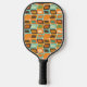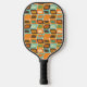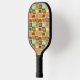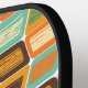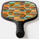 Dieses Paddel aus Pickleball hat ein modernes Design von abgerundeten Rechtecken, die seitlich ausgerichtet sind, mit schrägen Rechtecken aus Linien, die alle in den Farben der 70er Jahre gefertigt wurden.