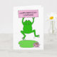 Ein niedlicher Cartoon-Frosch springt hoch und hält ein pastellrosa Schild mit der Aufschrift "Happy Birthday Leapling".
