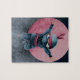 Warrior Ninja mit dunkelblauem Outfit mit einem roten Kopfband und einem roten Sash, der durch die Wolken vor einem blutroten Mond auf einem im dunklen Nachthimmel springen.