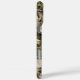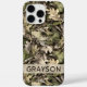 Customize this leaves camouflage iPhone 16 pro max case with your name in a trendy modern CAP font in brown on opaque cream. It's masculine and perfect for your favorite military, hunting, country or outdoorsman!