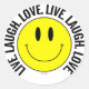 "Lebe. Lachen. Liebe." Gelber Smilie Rundglanz Aufkleber. Entworfen von SMILIEWEAR™. Spread ein wenig Glück! Große und kleine Aufkleber erhältlich. OPTIMIERTE HINTERGRUND-OPTIMIERTE HINTERGRUNDOPTIONEN. Ein lustiger und fröhlicher Aufkleber für die Geschenkverpackung, ein persönliches Accessoire oder einen Geburtstag- oder Weihnachts-Party-Aufkleber. Was könnte besser sein als ein Aufkleber mit einem Lächeln?