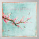 Wunderschönes künstlerisches Kunstwerk eines blühenden Kirschbaumzweiges mit einigen Schmetterlingen, die auf türkisfarbenem und rosa Vintagem Grunge-Hintergrund herumfliegen. Sieht schön aus auf Plakaten und Kunstdrucken. Made with Liebe by UtArt