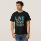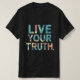 Der T - Shirt zeigt den fett gedruckten Text "Live Your Truth" in einem lebendigen, farbenfrohen Design. Jeder Buchstabe platzt mit einer anderen Farbe, wodurch ein Spektrum von Selbstausdrücken über die Brust entsteht. Der Hintergrund ist eine einfache, solide Farbe, um den Text in der Mitte Bühne lassen.