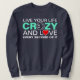 Lebe dein Leben verrückt und Liebe jede Sekunde davon. Funny Sprichwort Design mit einem Gesicht und einem Herz.