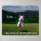 Ein schönes, lebendiges Poster eines Hundes, das durch ein Feld begrenzt wird, mit einem Ausdruck reiner Freude und Freiheit und den Worten: "Lebe... wie jemand das Tor offen verlassen hat."