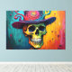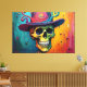 Ein lebendiges und farbenfrohes abstraktes Skelettportrait mit einem stylischen, breiten Hut. Frische Farbspritzen und dynamische Pinselstriche sorgen für eine auffallende Verschmelzung von Leben und Tod, die Individualität mit einer künstlerischen Drehung zelebriert.