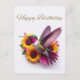 Ein fliegender Kolibri mit Sonnenblumen, Gassen und Tulpen Glücklicher Geburtstag in Goldschrift