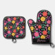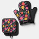 Dieses ofenfarbene Set aus Mitt ist botanisch inspiriert mit orangefarbenen, rosa und gelben Blumen und Blätter auf schwarzem Hintergrund. Personalisieren Sie es mit einem Namen.