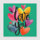 Eine fröhliche, emotional ausdrucksstarke und schön gestaltete Aquarell-Illustration, geeignet für Grußkarten, digitale Grafiken und romantische oder freundliche Nachrichten. Das Bild zeigt den Ausdruck "Love You" in fettem, lässigem schwarzen Pinselskript, überlagert über eine Gruppe von hellfarbigen Herzen. Die Herzen sind in einer lebendigen Aquarelltextur mit vielfältigen, satten Farben wie Gelb, Magenta, Türkis, Pink und Orange gestaltet.