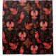 Lebendige rote Vögel mit detaillierten Mustern sind vor einem schwarzen Hintergrund gesetzt, umgeben von komplizierten Blumen- und Blattdesigns, wodurch eine lebendige, ornamentale Szene entsteht.