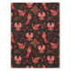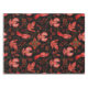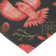 Lebendige rote Vögel mit detaillierten Mustern sind vor einem schwarzen Hintergrund angeordnet, umgeben von aufwendigen Blumen- und Blattdesigns, wodurch eine lebendige, ornamentale Szene entsteht.