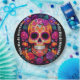 Die runde Papierplatte besticht durch eine bezaubernde Szene, die mit lebhaften Farben und einem tiefen schwarzen Hintergrund aufwartet. Im Zentrum steht ein auffallender orangefarbener Zuckerschädel. Die aufwändigen Designs und Muster strahlen eine Atmosphäre des Feierns und der Erinnerung aus. Ein belebter Blumenstrauß mit rosa, lila und orangefarbenen Blume umringt den Schädel und schafft ein Kaleidoskop von Farben. Jedes Blatt und jede Blüte ist sorgfältig detailliert, was zu der allgemeinen Opulenz der Zusammensetzung beiträgt. Der Kontrast zwischen den lebendigen Elementen und der dunklen Kulisse schafft ein visuell atemberaubendes und emotional resonantes Bild. Die runde Papiertafel prägt das Wesen von Día de Muertos mit seinen lebhaften Farben, aufwändigen Kunstwerken und einem durchdachten Design. Es dient als passende Hommage, um die Erinnerungen von Lieben zu feiern.