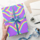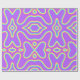 Ein sich wiederholendes, symmetrisches Muster in lila Farbtönen mit hellgelben, hellblauen und hellen aquamarinen Konturen, die einen 3D-Effekt erzeugen. Die Farbpalette ist lebendig und fröhlich, was ein spielerisches und etwas skurriles visuell macht. Die Wiederholung des Designs macht es scheinbar unendlich.