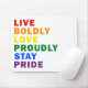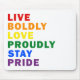 Live Bolly Liebe Bleibe stolz Pride Mousepad Design in moderner Typografie, die "LIVE BOLDLY LIEBE PROUDLY BLEIBE PRIDE" in einem einfachen, aber sauberen minimalistischen Design. Einfaches Design in Pride Regenbogenfarben, das für jeden gut funktioniert.