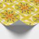 Aufgerollter Stoff mit einem lebendigen gelben geometrischen Muster mit roten und blauen Blumenmotiven. Eine flache Ansicht zeigt das wiederholte Motiv. Hell und fröhlich.