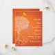 Eine verzierte Darstellung eines Baumes des Lebens dominiert die Vorderseite dieser farbenfrohen Bat Mitzvah Save the Date Einladung. Der Baum ist auf der links Seite von der Einladung abgeschnitten und hat Blätter, die von ihm fallen. Ein hellgelber Vogel hat über dem Gipfel des Einladens geflogen. Angepasste, Save the Date gedruckte Texte werden auf der rechten Seite vor dem lebhaften orangen Hintergrund gedruckt. Das Gegenteil wiederholt den Baum als ein kleineres Symbol, wobei der Name des Mädchens Bat Mitzvah unten zusammen mit dem Datum der Veranstaltung gedruckt wird. Verfügbar mit passenden Produkten.
