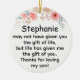Dieses herzerwärmende Design feiert die Verbindung zwischen Schwiegermutter und Schwiegertochter und bringt Liebe und Wertschätzung zum Ausdruck. Es enthält die Botschaft: "Ich habe dir vielleicht nicht das Geschenk des Lebens gegeben, aber das Leben hat mir das Geschenk von dir gegeben. Danke, dass du meinen Sohn geliebt hast!" Ideal für Ferien oder besondere Anlässe. Es ist eine nachdenkliche Hommage an die Lieben.