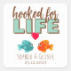 Adorable Save the Date Aufkleber mit zwei niedlichen Fischen, die sich gegenüberstehen und über ihnen ein rotes Liebe-Herz schwebt. Ein Fisch ist blau und ein Fisch ist orange. Oben sind die Worte "Hooked On Life" in einem braunen und pastellfarbenen aqua grünen Text. Unter den Fischen sind Vorlagen, um die Namen der Braut, Bräutigam und das Datum hinzuzufügen.