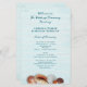 Hochzeitsprogramm für Lebende Meere, gedruckt auf bezahlbarem Papier. Passen Sie Text auf beiden Seiten über ein hellblaues Holzbild an. Auf der Vorderseite hat der Boden realistische Muscheln und einen Sand-Dollar. Text ist Tiefseeblau und wechselt zwischen Skript und gedruckten Schriftart. Auf der Rückseite ist Platz für eine kurze Nachricht des Paares. Das Papier hat eine Größe von 5,5 x 8,5.