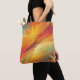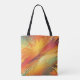 Lebhafte abstrakte Explosion von warmen Farben wie Orange, Rot, Gelb und Blau mit dynamischen diagonalen Linien und Formen Tasche