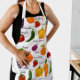Eine Frau trägt selbstbewusst eine farbenfrohe Schürze, die mit verschiedenen Obst- und Gemüsesorten wie Erdbeeren, Gurken und Paprikaschoten geschmückt ist.