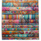 Entfesseln Sie Energie mit unserem lebhaften, farbenfrohen gestreiften Textildesign. Mit seinen hellen, horizontalen Streifen in Rosa, Blau, Orange und Gelb, die jeweils mit einzigartigen Blumen-, Paisley- oder geometrischen Mustern versehen sind, besticht dieser Stoff durch seinen lebendigen böhmischen Stil.