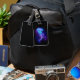 Große, blaue, künstlerisch gezeichnet, leuchtende, helle Quallen, mit langen Tentakeln auf schwarzem Hintergrund mit lila Biolumineszenz. Leuchtende Quallen.