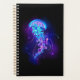 Große, blaue, künstlerisch gezeichnet, leuchtende, helle Quallen, mit langen Tentakeln auf schwarzem Hintergrund mit lila Biolumineszenz. Leuchtende Quallen.
