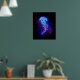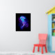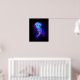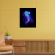 Große, blaue, künstlerisch gezeichnet, leuchtende, helle Quallen, mit langen Tentakeln auf schwarzem Hintergrund mit lila Biolumineszenz. Leuchtende Quallen.