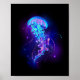 Große, blaue, künstlerisch gezeichnet, leuchtende, helle Quallen, mit langen Tentakeln auf schwarzem Hintergrund mit lila Biolumineszenz. Leuchtende Quallen.
