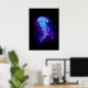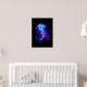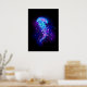 Große, blaue, künstlerisch gezeichnet, leuchtende, helle Quallen, mit langen Tentakeln auf schwarzem Hintergrund mit lila Biolumineszenz. Leuchtende Quallen.
