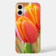 Dieser Fall zeigt ein nahes Blumenfoto mit leuchtend gelben, orangefarbenen Tulpen. Ein buntes Design für ein neues Telefon oder ein Geschenk für jemanden Besonderes.