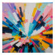 Ein dynamischer Berst von bunten geometrischen Formen, der von der Mitte ausstrahlt und ein beeindruckendes modernes Design schafft. Die kühnen Pinselstriche und lebhaften Farbtöne verleihen diesem Stück ein dynamisches und künstlerisches Ambiente, das sich perfekt für Dekoration und Mode eignet.