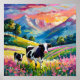 Ein herzzerwärmendes, modernes impressionistisches Gemälde einer Mutterkuh und ihres Kalbes in einer ruhigen, ländlichen Alm, das durch helle, lebendige Farben und dicke abstrakte Pinselstriche zum Leben erweckt wird. Die dynamischen Striche festigen die friedliche Verbindung zwischen den Tieren, während die reichen Farbtöne Grün, Blau und Erden eine lebendige, pastorale Szene schaffen. Dieses ausdrucksvolle Kunstwerk verbindet wunderbar Natur und Zärtlichkeit, perfekt um jedem Raum Wärme und Charakter zu verleihen.