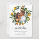 Elegante Citrus botanische speichern die Daten verfügen über ein Lieblings-Verlobung-Foto umgeben von einem runden Kranz von pulsierenden Zweigen von Mandarinen Zitrusfrüchten und Clementine, Elfenbeinblüten und Blätter, "Save the Date" in Kalligraphie Schrift, mit Ihren Namen, Hochzeitstag und Lage unter dem klassischen grauen Serifentyp. Lebhafte Grüntönen, helle Mandarine, Orange und weiche weiße Blume sorgen für ein harmonisches Ambiente. Die Rückseite weist einen zusätzlichen orangefarbenen Hintergrund auf. Ideal für mediterran inspirierte Hochzeiten, sizilianische Themenhochzeit und bohobische botanische Hochzeiten das ganze Jahr über. Diese Designs können für Ihren besondere Anlass personalisiert sein und wären perfekt für Ihre Hochzeit, Brautparty, Verlobungsfeier, Geburtstagsparty und viele weitere besondere Anlässe. *** Für individuelle Anfragen schreiben Sie bitte eine E-Mail an citronelladesign@gmail.com.