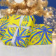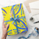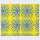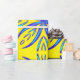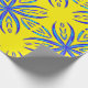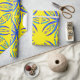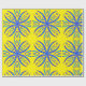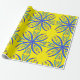 Dieses Verpackungspapier zeichnet sich durch ein fröhliches und künstlerisches Design aus. Ein hellgelber Hintergrund ist die Leinwand für ein sich wiederholendes Muster gekrümmter, blattähnlicher Formen in lila- und blauen Farbtönen, das ein lebendiges und fließendes Blumenbild schafft.