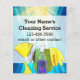 Personalisieren Sie dieses farbenfrohe, farbenfrohe Werbegeschenk-Produkt mit Ihrem Reinigungs- oder Hausmeisternamen und Ihren Angaben. Das Aqua und die hellblauen Strahlen mit hellen Hintergrundfarben sind mit einem gelben, handgehaltenen Federbalg, einem grünen Eimer mit Lappen und einer blauen Sprühlösung versehen.