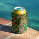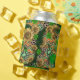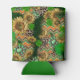 Das Bild zeigt eine Dose cooler mit einem lebhaften und eklektischen Design. Das Muster zeigt große, detaillierte Sonnenblumen mit gelben Blüten und braunen Zentren, die über die Oberfläche verteilt sind. Unter den Sonnenblumen sind grüne Kleeblatt, die dem Design eine Touch Glück und irischen Charme verleihen. Der Hintergrund ist eine Mischung aus Tierdruck, insbesondere Leoparden, und Zickzack Zickzackstreifen in Grün-, Orange- und Beigetönen. Es gibt auch Haufen von grünen Edelsteinen, die einen funkelnden Effekt in das Gesamtbild hinzufügen. Die Kombination dieser Elemente schafft eine lebendige und auffällige Ästhetik, die die Dose sowohl interessant als auch einzigartig macht.