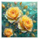 Lebhafte und faszinierende gelbe Rosendarstellung, schön auf einem weichen, blauen und grünen Hintergrund angeordnet. Jede Rose hat mehrschichtige Blätter, die eine Reihe von weichen rosa Farbtönen mit goldenen Konturen zeigen, die ihre Kurven verstärken. Die Rose sind mit üppig grünen Blätter verwoben, die Tiefe und Kontrast erhöhen. Außerdem schmückt die Szene mit schimmernden Wassertröpfchen und schillernden Blasen, die die Frische und Lebendigkeit der Komposition verbessern und ein Gefühl von Eleganz und Delikatesse schaffen. Das Bild zeigt eine lebendige und visuell atemberaubende Anordnung von gelben Rosen, umgeben von einem schimmernden Hintergrund. Die Rose sind in voller Blüte dargestellt und zeigen zarte Blütenblätter, die Gelb- und Goldtöne vermischen, mit aufwändigen Details, die ihre Texturen hervorheben. Unter den Blume sind glitzernde Wassertropfen, die eine Wirkung von Frische und Vitalität erzeugen. Diese Tröpfchen fangen das Licht und fügen der Szene eine dreidimensionale Qualität und Tiefe hinzu. Der Hintergrund ist eine Mischung aus Türkis und Grün, was die Helligkeit und Schönheit der Blume erhöht. Einige Blätter in verschiedenen Grüntönen begleiten die Rose und ergänzen die Komposition. Die Ästhetik ist eine von Eleganz und Lebensfreude, die einen Moment der Schönheit in der Natur einnimmt.