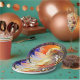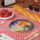 Ein lebendiges Set von Tellern aus Papier, das ein Aquarellbild eines Mädchens zeigt.