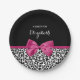 Trendy, schwarz-weiße Leopardendruckpapier-Teller mit einem lebendigen dunkelrosa Farbband, das in einem niedlichen gürtelförmigen Bogen befestigt ist. Personalisieren Sie dieses elegante und stilvolle Tiermuster-Design, indem Sie den Namen Ihres Teenager-Party-Mädchens hinzufügen. Flachbild, NICHT echtes Band.