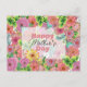 Die Postkarte des Muttertags ist eine lebendige Feier von Farbe und Zuneigung. Die Blume ist mit ihren zahlreichen Blumenmotiven geschmückt, die von den warmen Farbtönen Rosa und Orange bis hin zu den coolen Grün- und Blautönen reichen. Die Blume verflechten sich und schaffen einen faszinierenden Garten, der direkt vor der Karte zu blühen scheint. Im Zentrum, eingebettet in dieses blumengeschmückte Spektakel, werden die Worte "Happy Mother’s Day" in elegantem Schriftart eingebettet, stehend als ruhiger Mittelpunkt inmitten der lebendigen Kulisse. Das Design der Postkarte ist individuell anpassbar, sodass persönliche Touchs hinzugefügt werden können. Das macht es nicht nur zu einer Postkarte, sondern zu einem einzigartigen Kunstwerk, das Ihre Herzlichen Wünsche am Muttertag vermittelt.