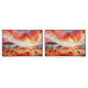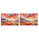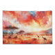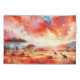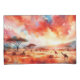 eine atemberaubende Mischung aus feurigen Roten, Orangen und Blues, die das Wesen eines afrikanischen Sonnenuntergangs einfangen. Die Silhouetten von Akazienbäumen und Weidegiraffen schaffen eine ruhige und malerische Szene.