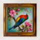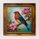 Farbenfrohe Kunstwerke eines auf einem rosa blühenden Zweig ruhenden Liedes, in einem eleganten goldenen Rahmen präsentiert, der eine Harmonie von Kunst und Natur darstellt.
