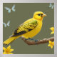 Farbenfroher Gelbvogel mit blauen und grünen Akzenten Erholungen auf einem Ast inmitten lebendiger Blätter und heller Schmetterlinge.