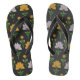 Ein auffälliges Muster mit gelben und violetten Blumen mit grünen Stielen und Blätter auf schwarzem Hintergrund.