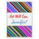 Das Design der Grußkarte zeichnet sich durch ein lebendiges und auffälliges gestreiftes Muster aus, das eine Vielzahl von Farben aufweist. Auf der Vorderseite befindet sich auch die ermutigende und unterstützende Nachricht "Get Well bald" sowie der benutzerdefinierbare Name des Kartenempfängers. Im Inneren befindet sich eine individuell anpassbare Get-well-soon-Meldung, die den Empfänger der Karte trösten soll. [~Z0000063]
