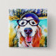 Dieser quadratische Knopf zeigt ein lebendiges Kunstbild eines gelächelten Golden Retriever Hundes, der einen Hut und eine Brille mit schwarzem Nerd trägt.