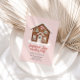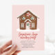 Diese festliche rosa Einladung zeigt ein großes Aquarell-/Gouache-Lebkuchenhaus mit weißem Eis und grünen und roten Pfefferminzen mit Schneeflocken, die das Haus umgeben. Auf der Rückseite der Karte befindet sich ein Aquarellpinken und ein rotes Streifen. Die Karte enthält auch Vintage Typografie für die Details des Party und ein lustiges skurriles Skript für den Veranstaltungstitel in rot.