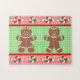Ein lächelndes Lebkuchenmädchen und -junge mit den Bögen und roten Knöpfen, zum ihrer Ausstattungen zu verzieren. Grüner Ginghamhintergrund und rote Ginghamgrenze mit Pfefferminzsüßigkeiten.